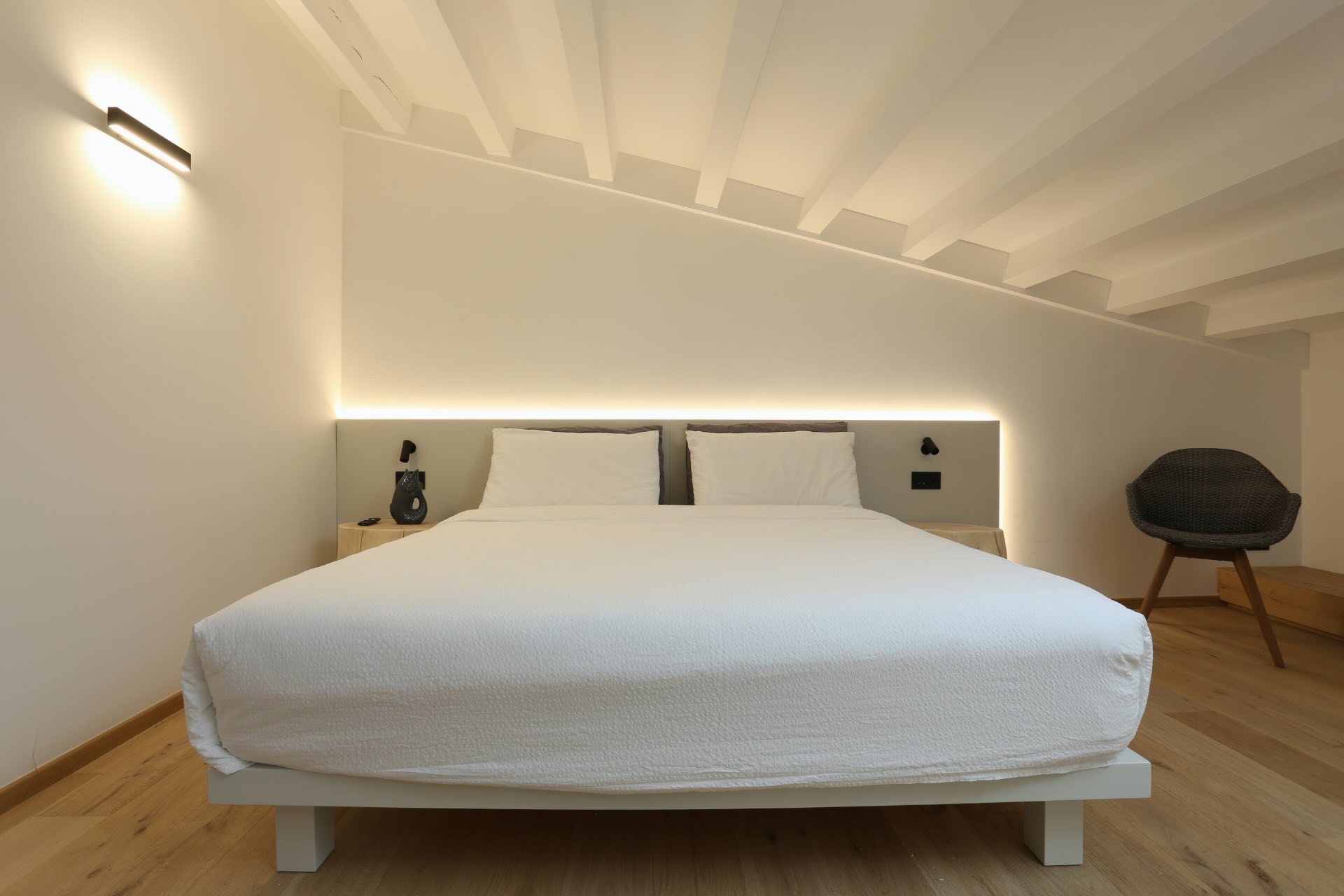 Simmons Sommier Black Diamond Doppelmatratze (90×180 cm, Höhe 35 cm), Artemide-Designer-Lampen, Vitra-Sessel, Ganzkörperspiegel, Parkettboden. N.2 Zimmer für Behinderte zugänglich.
